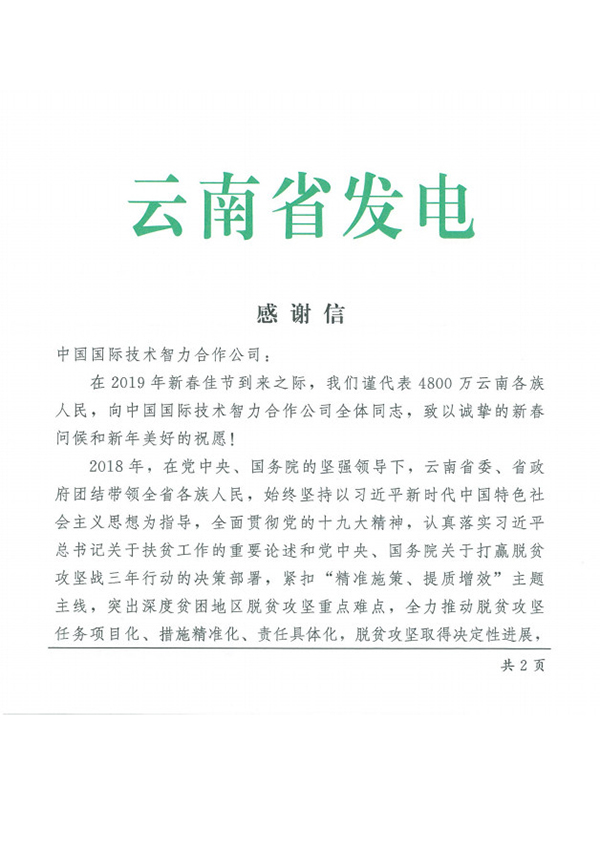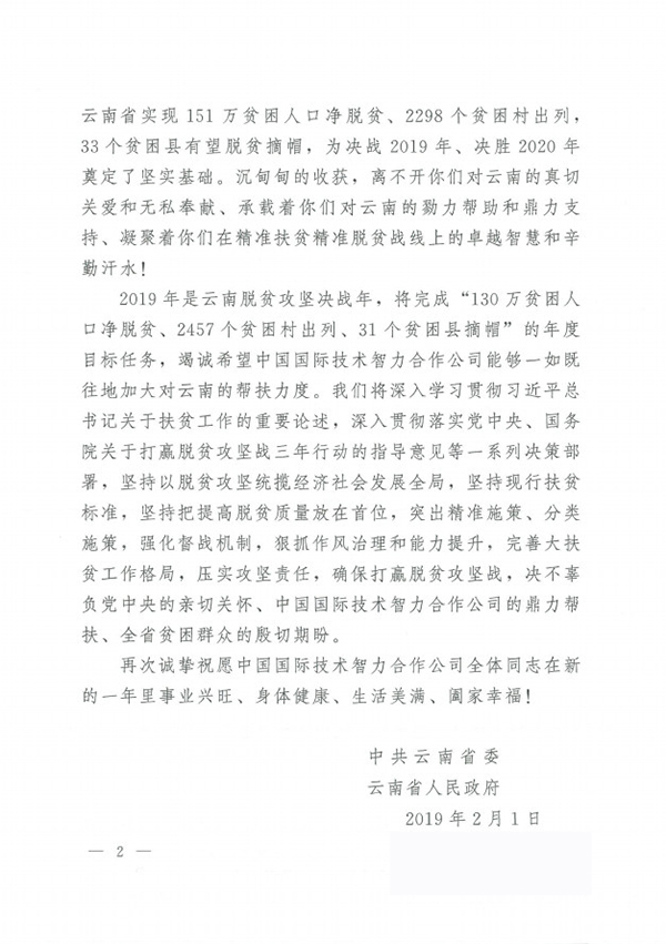 2019年春节前夕,中共云南省委、云南省人民政府向中智公司等单位发出感谢信,感谢中智公司等相关单位对云南脱贫攻坚的支持。希望中智公司进一步加大对云南的定点帮扶,为云南脱贫攻坚决战2019年、决胜2020年做出更大贡献。