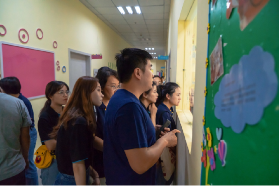 志愿者们首先参观了孩子们的学校,葛老师向志愿者们介绍说,孩子们入校时会根据综合能力分级,进行不同程度的课程安排。有锻炼个人独立学习能力的个人工作系统教程,有锻炼孩子手部精细化操作的精细教程,还有通过游戏方式了解社会、人际沟通交往的游戏社交教程等。整体课程分为阶梯性安排,随着学习能力的不断完善和提升,孩子们有机会成功晋级至幼小衔接班,可以踏入社会与普通孩子们一起正常上课。孩子们的康复离不开家长的陪护,因此学校除了有针对孩子的评估教学,还有为家长而专门准备的理论和操作培训班,让家长们可以更细致、更专业地陪伴孩子一起康复。