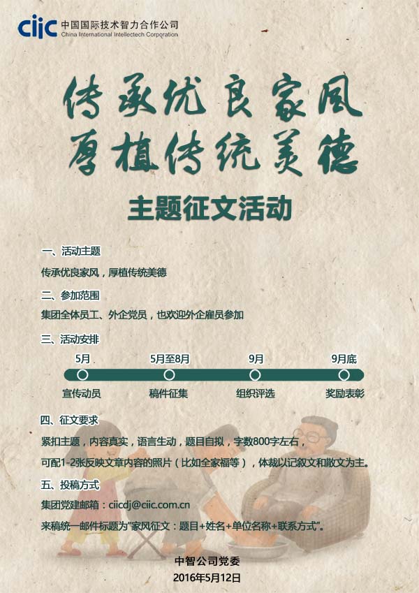 集团党建邮箱:ciicdj@ciic.com.cn;来稿统一邮件标题为“家风征文:题目+姓名+单位名称+联系方式”。