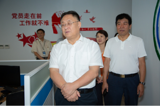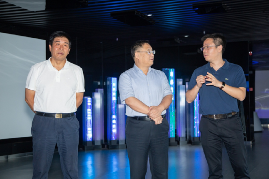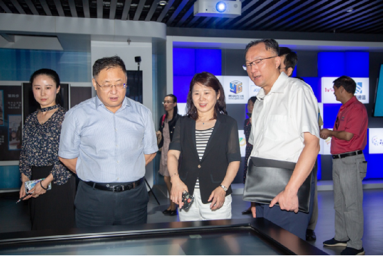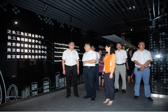 中智公司党委书记、董事长卜玉龙、中智江苏公司党支部书记、总经理吴晓兰在建邺区区委组织部副部长郭震环陪同下参观南京市建邺区高新区(科技园)展厅