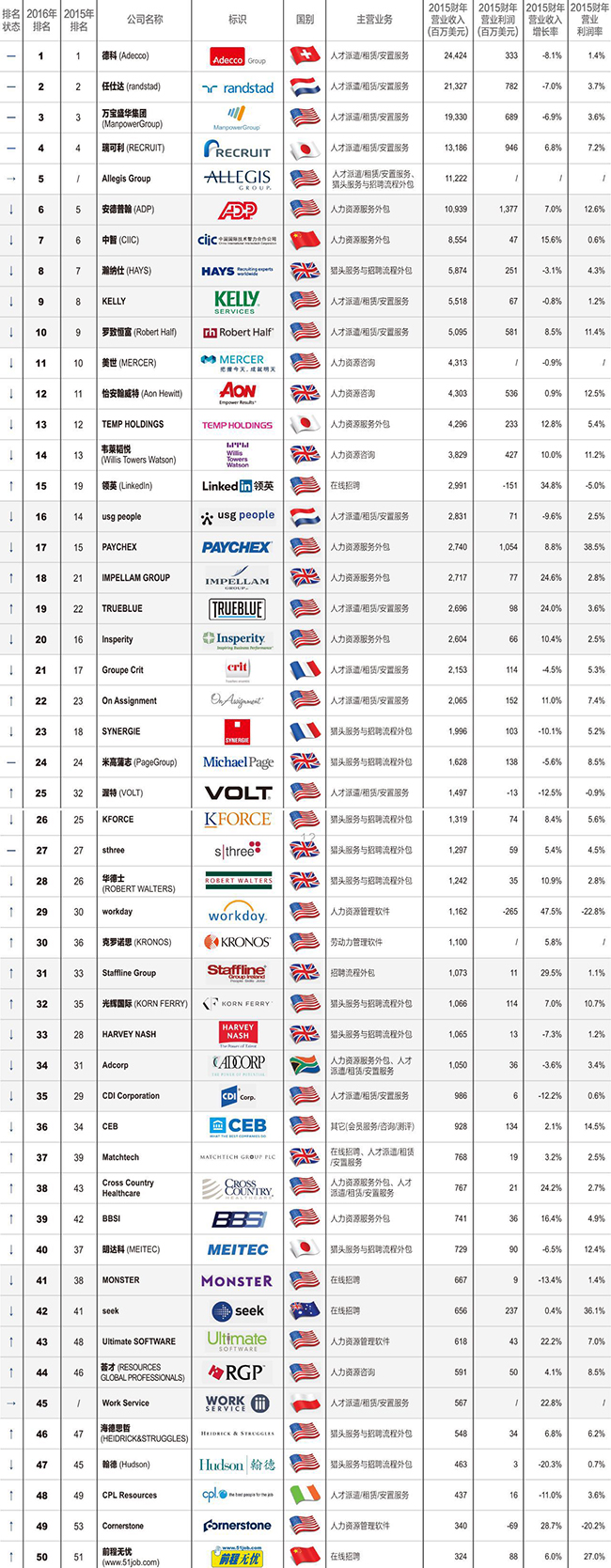 上榜“2016HRoot全球人力资源服务机构50强”榜单的企业来自全球十三个国家,业务主要覆盖六大领域,包括人力资源服务外包、人才派遣/租赁/安置服务、猎头服务与招聘流程外包、人力资源咨询、人力资源管理软件以及在线招聘。“HRoot2016全球人力资源服务机构50强”依据企业财年营业收入高低进行排名,并采用当地货币与美元的全年平均汇率,将企业的销售收入统一换算为美元,以剔除全年利率变动对排名的影响。